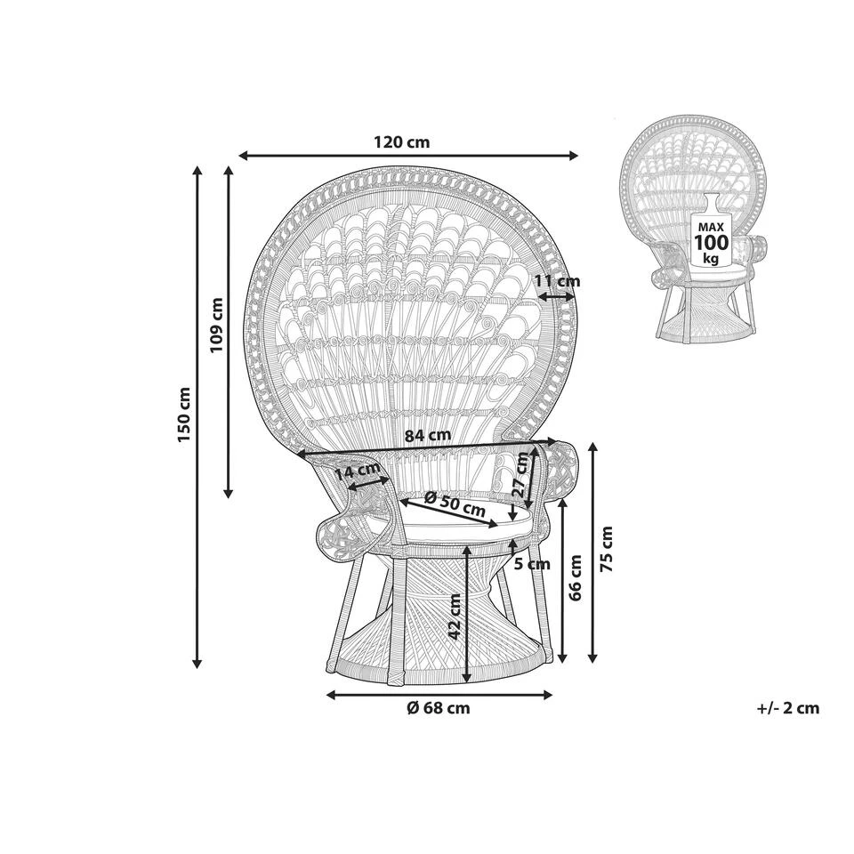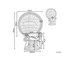 Volumineuze pauwenstoel van zwart rotan. Het meest onderscheidende meubelstuk uit de jaren 60 en 70 is terug en is nog steeds stijlvol. De romantische en speelse waaiervormige rugleuning, doet denken aan een wijd open verenstaart van een pauw, is een ultieme blikvanger en geeft de fauteuil een majestueus en dromerig karakter. Dankzij de prachtig geweven rotan details wordt de stoel het middelpunt van elke boho ingerichte woonkamer.