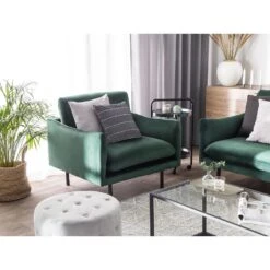 Stijlvolle fauteuil met een moderne uitstraling . Een hoogstandje van modern design! Deze ogenschijnlijk eenvoudige maar juist zeer decoratieve fauteuil wordt het nieuwe centrum van je woonkamer. De zetel heeft een aangenaam fluweel zachte bekleding in elegant groen. De ranke, zwarte poten geven deze design fauteuil een esthetische lichtheid.